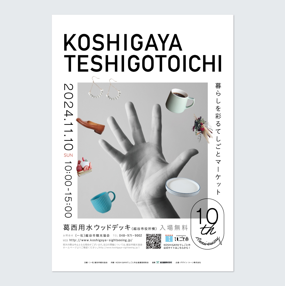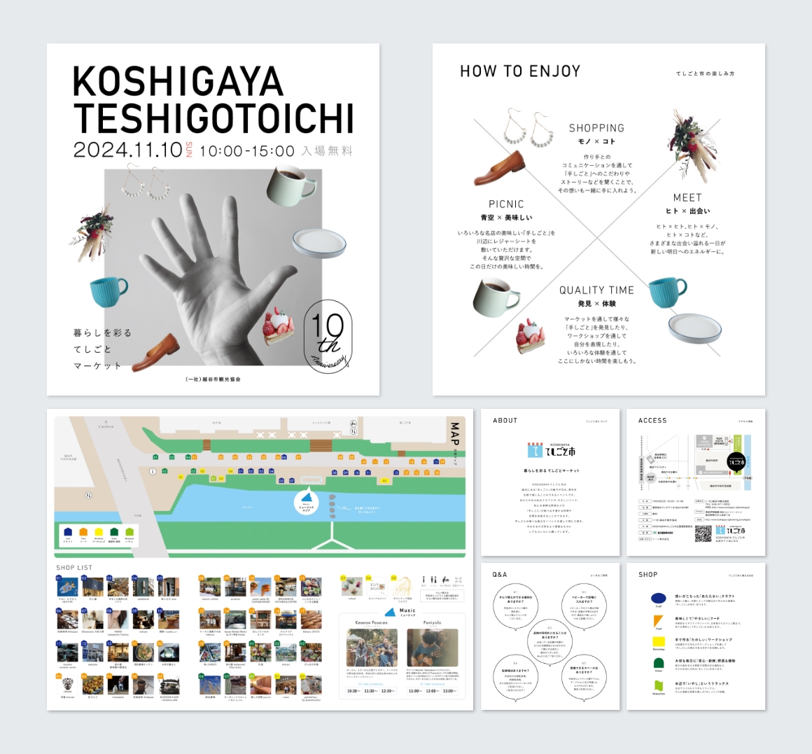 越谷の「手しごと」の魅力を身近に感じれるイベント、「KOSHIGAYAてしごと市」のツール制作を担当。その道の職人のクラフトやフードなど集まるイベントであることを表現するため、「作る」工程にかかせない手の画像(実際に陶芸家様の手を撮影)をメインに、そこから広がるモノ×コトの画像をコラージュしてデザイン。