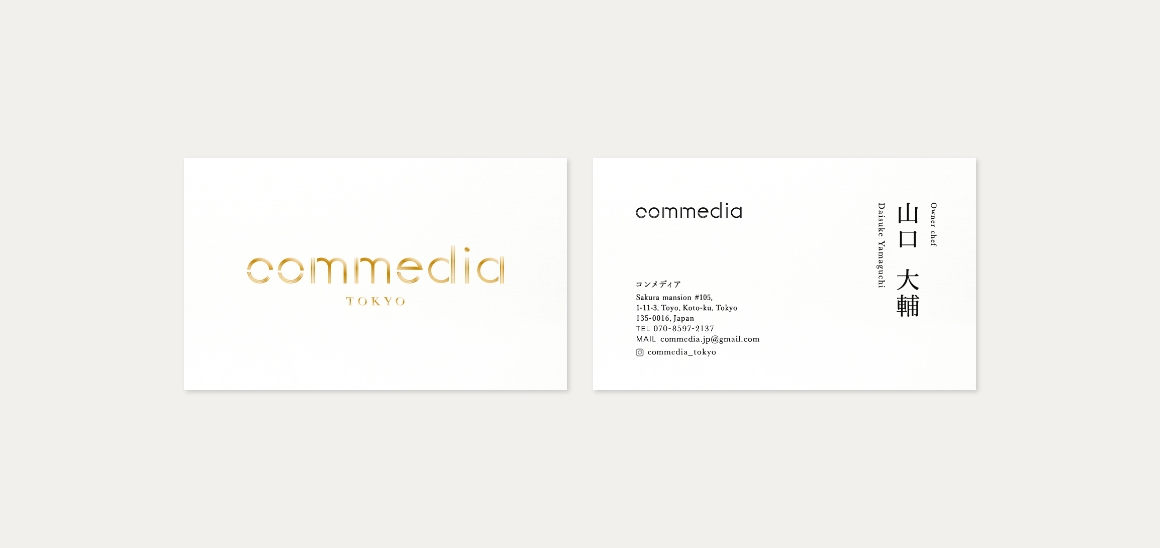東京・木場に上質な大人の隠れ家イタリアン「commedia(コンメディア)」のロゴリニューアルを担当。コンメディアはイタリア語で「喜劇」。目の前で料理ができあがっていくライブ感とともに劇場のように楽しんでほしいというシェフの思い・コンセプトのもと、サンセリフ体のフォントをベースに劇場らしさのある少し遊び心あるロゴデザインを制作。